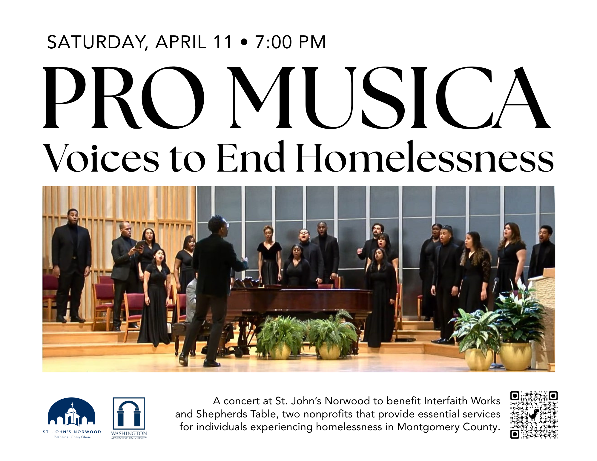 On Saturday, April 11, the premier vocal ensemble Pro Musica returns to St. John's Norwood for "Voices to End Homelessness," a concert to benefit Interfaith Works and Shepherd's table, two nonprofits—and longtime partners of St. John's—that provide essential services for individuals experiencing homelessness in Montgomery County.  Pro Musica's  performance will include songs from their upcoming new recording, Psalms, Hymns and Spiritual Songs, Volume 2.